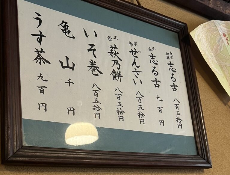 しるこやぜんざいを紹介するお品書きを店内の額縁に飾って頂いております。